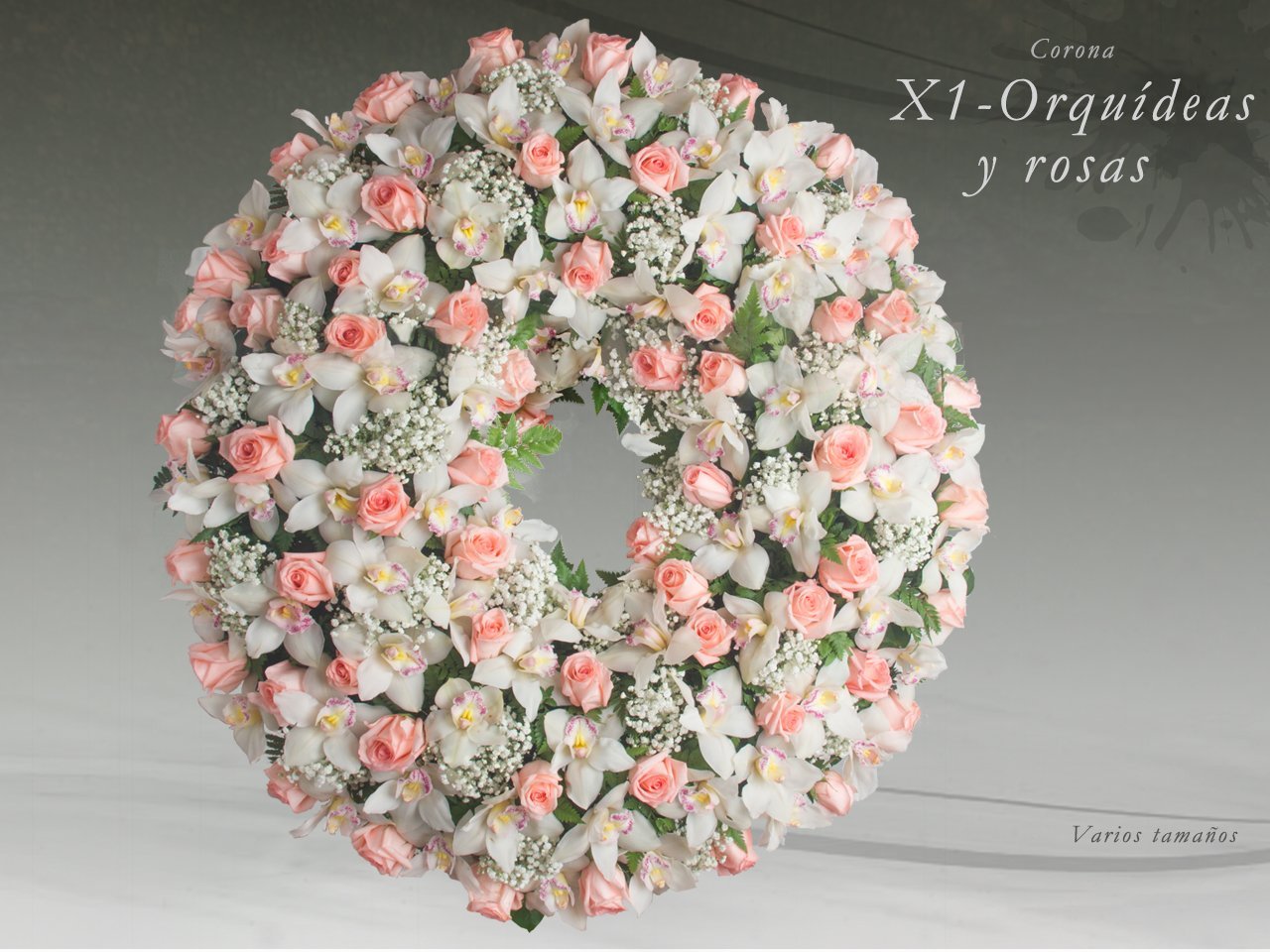 Corona elaborada con orquídeas naturales, adornada con rosas, aspidistra y gipsofila paniculata.