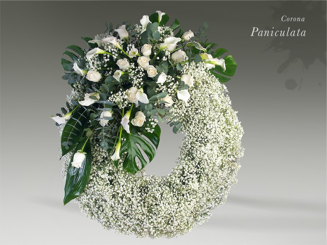 Corona elaborada con flor natural. Composición circular compuesta por gipsofila paniculata, rosas blancas y calas blancas con distintos verdes.