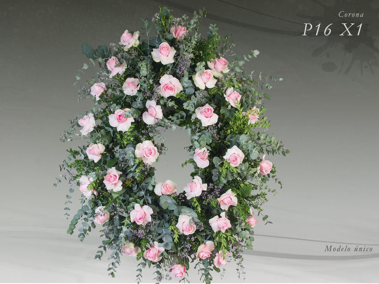 Corona elaborada con flores naturales. Realizada sobre verdes variados: eucalipto, helecho cuero y boj. Adornada con rosas abiertas de primera calidad en suaves tonos rosas.