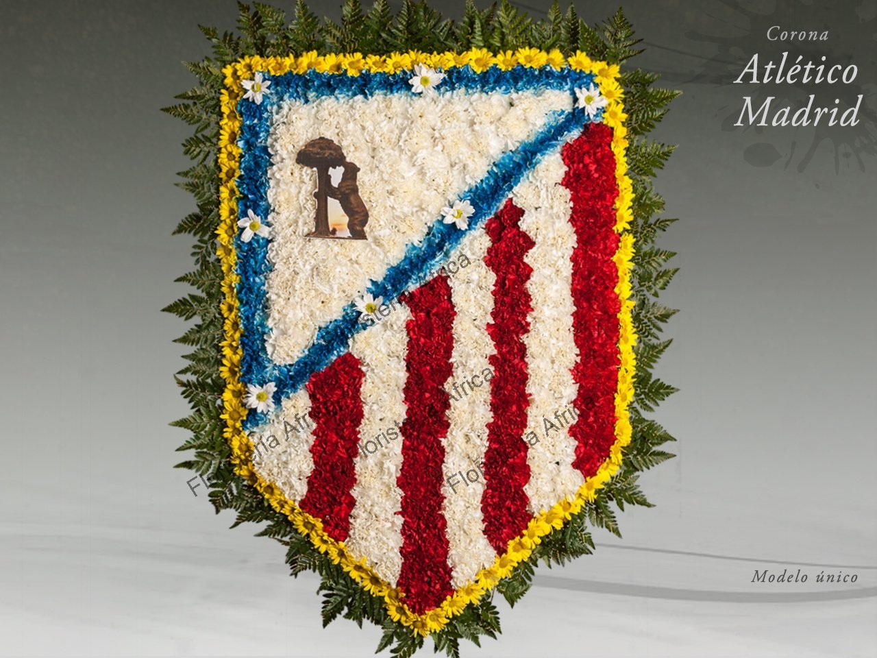 Corona especial elaborada con flores naturales. Composición en escudo con claveles con los colores corporativos del Club y adornado con margaritas.